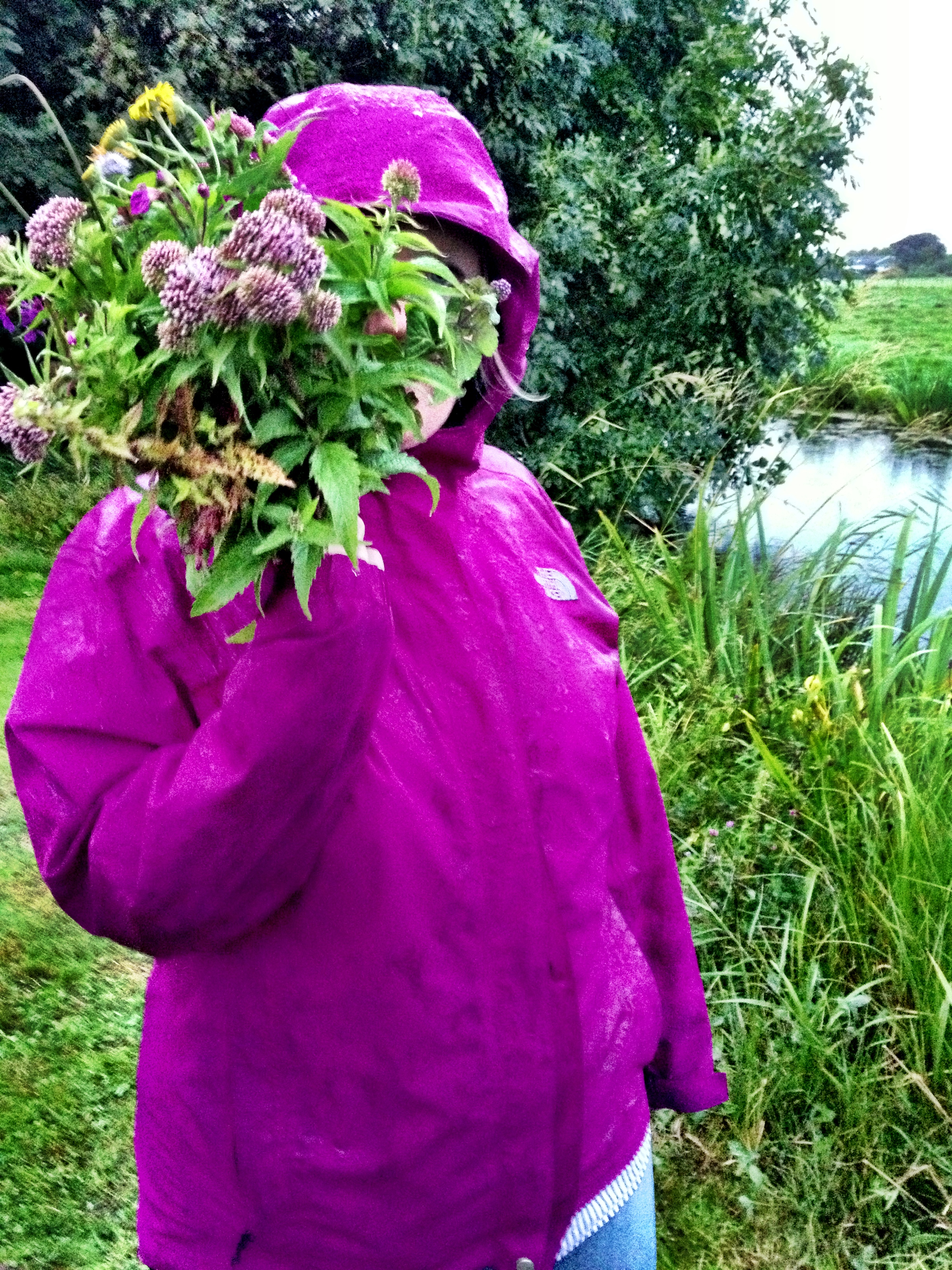De excursie was georganiseerd door Petra Elzinga en Dirk Vergeer en was vooral bedoeld voor mensen die nog niet zolang in het dorp wonen. Het weer was die dag niet best, maar rond de periode van de excursie leek het op de buienradar droog te zijn, dus de excursie kon van start gaan. Zestien mensen hadden zich aangemeld en verzamelden zich rond 18:30 uur in de schuur op het landje. Na een kopje koffie of thee en wat uitleg door Dirk, over het ontstaan van het landje, ging men in twee groepen op weg. De groepen kregen de opdracht mee om bloemen te verzamelen. Ondanks het gunstige beeld op de buienradar ging het regenen en in combinatie met de wind was het behoorlijk koud. Desondanks genoot iedereen van de mooie natuur en de uitleg van de gids Cees van der Starre. Wist ú dat de blaadjes van riet om de steel kunnen draaien, zodat als het hard waait de blaadjes zo gunstig mogelijk ten opzichte van de wind gaan staan zodat de stengel niet breekt? Bijzonder hè.