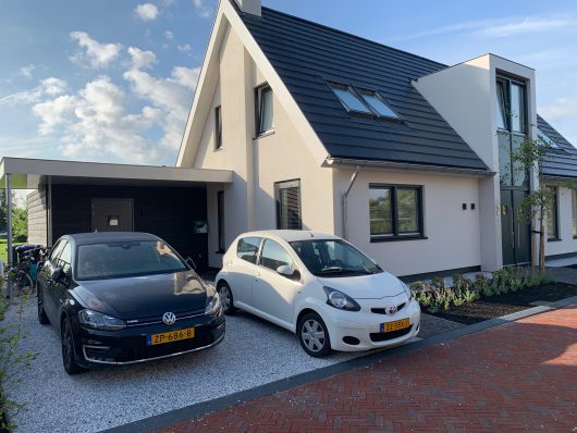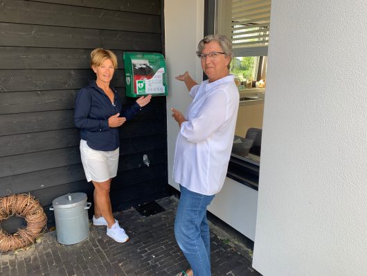 De AED hangt aan de voorzijde van de schuur van Kerkvliethof 2. In de carport.