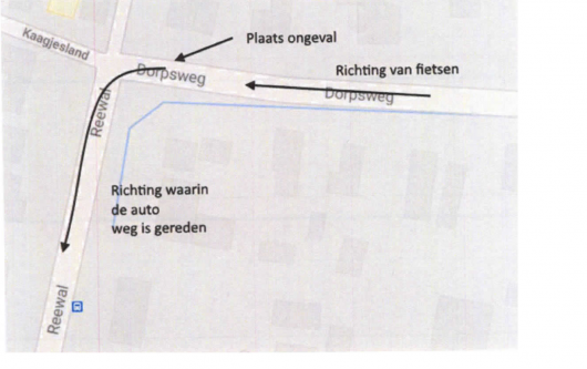 We fietsten met z’n tweeën achter elkaar op de racefiets vanaf de Nieuwdorperweg over de Dorpsweg naar de kruising met de Reewal toen de auto met hoge snelheid en gierende banden van achteren kwam aangereden en ons met slippende banden afsneed tegen de stoeprand aan. Daar ben ik over de kop geslagen. Direct daarna is de auto via de Reewal op hoge snelheid weggereden richting Gouda/Waddinxveen.