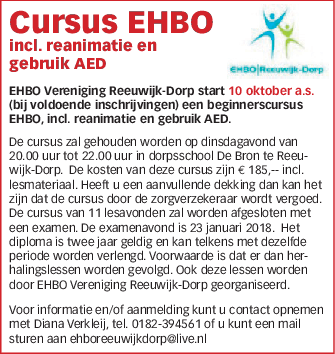 Ingezonden stuk: 10-10 start EHBO cursus, incl. reanimatie en gebruik AED in Reeuwijk-Dorp