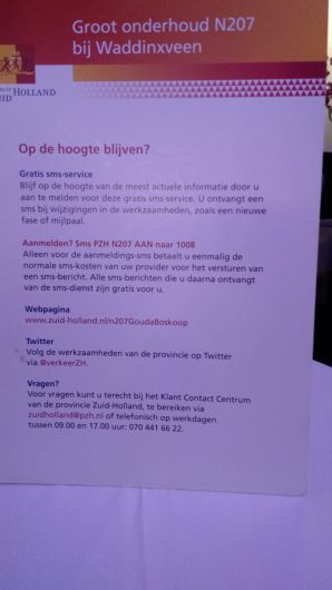 Men kan eventuele ontstane schade melden via het mailadres zuidholland@pzh.nl onder vermelding “werkzaamheden Brugweg/N207”, dan zou de mail op de juiste plek terecht moeten komen.