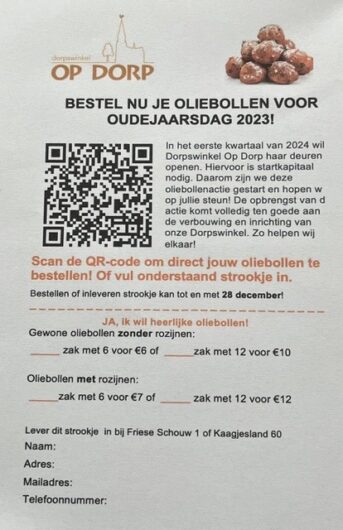 Dat had moeten zijn tot 28 december, iedereen kan dus nog tot 28 december onze heerlijke oliebollen bestellen en daarmee het opstarten van de dorpswinkel ondersteunen.